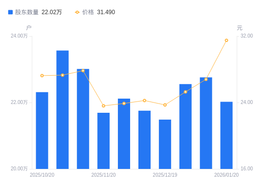 日期A股户数(户)流通A股户均持股数(股)户均持股市值(万元)2026-01-092275616905.5318.502025-12-312255606966.7917.612025-12-192148477314.1817.342025-12-102175397223.6717.512025-11-282211767104.8816.972025-11-202169277244.0517.102025-11-102301066829.1519.012025-10-312356806667.6418.202025-10-202231137043.2019.192025-10-102284656878.2121.82